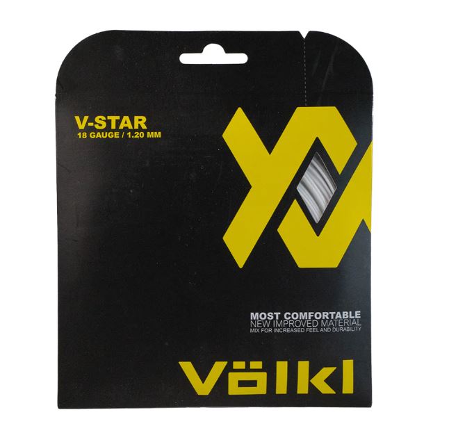 Volkl V-Star 18g String Tennis String White* V-Star is a smooth finish co-polymer string using advanced material technology. It offers outstanding durability and tension maintenance. Most played will find it to be one of the softest co-polymer strings on the market today. Players looking for one of the softest polys on the market with good spin and control should give V-Star a try!